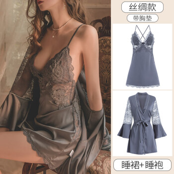 蕾丝小胸性感睡衣睡裙套装 莫兰灰[带胸垫]丝绸款2件套