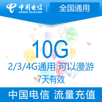 中国电信10G 7天流量包全国通用 7天有效 可跨月
